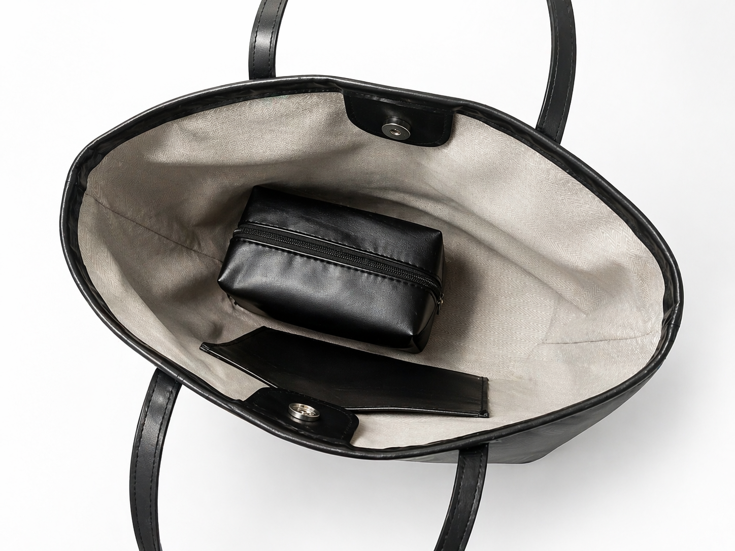 دستهها: دستههای چرمی مقاوم و دوختخورده که تحمل وزن وسایل داخل کیف را دارند